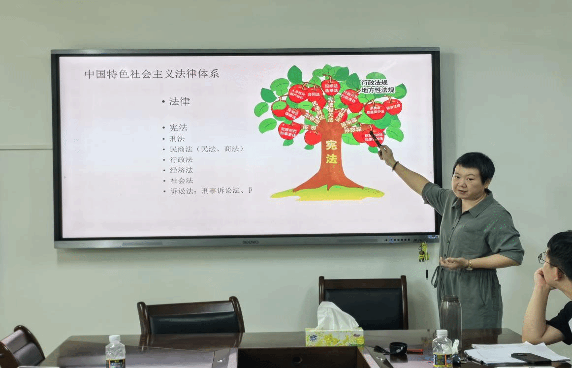会议第一阶段,主讲人说课。牛玉老师介绍了理想信念章节的教学思路、主要内容、教学重难点及在教育部课件基础上做出的修改。陈华老师结合法律专题第二讲的教学内容和个人的教学实践,提炼出两个教学难点问题,从“为何是难点”“难在何处”及“如何破解难点”三个方面展开说课示范。
