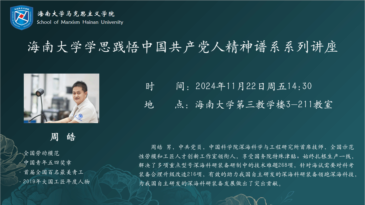 2024年11月22日下午,海南大学学思践悟中国共产党人精神谱系系列讲座正式开讲。学院邀请了中国科学院深海科学与工程研究所首席技师、2019年大国工匠年度人物周皓为2024级数学与统计学院本科生做专题讲座。周皓以“践行工匠精神 献身深海科考 新征程 再起航”为题,从成长经历、深海科考、工匠精神三方面为同学展开讲授,由凤翔书院郭孝伟老师主持,马克思主义学院蔡文举副院长参加。