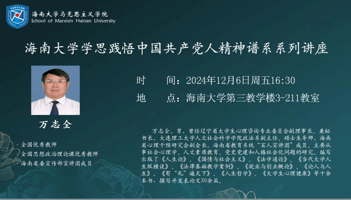2024年12月6日,永利集团88304官网邀请全国思想政治理论课优秀教师万志全作海南大学学思践悟中国共产党人精神谱系系列讲座报告。报告以“新时代教育家精神进校园”为主题,从教育家精神和人格社会化两个方面展开讲述。马克思主义学院蔡文举副院长参加。