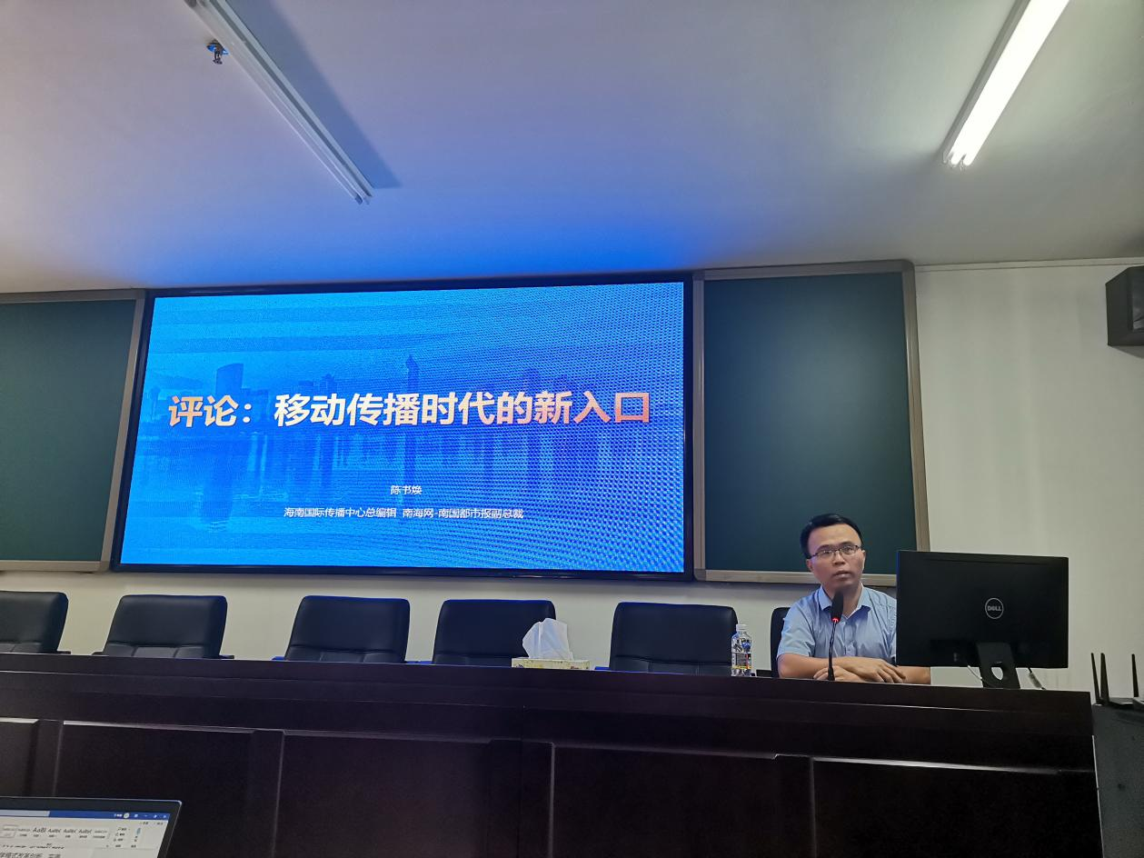 为进一步帮助同学们了解和掌握评论写作的要点和规则,更好的参与到评论写作中,11月13日下午,海南大学第26期形势与政策时事论坛在社科楼A309报告厅举办。海南省融媒体中心管委会委员、海南国际传播中心总编辑、南海网—南国都市报副总裁陈书焕受邀为海南大学师生作主题为《评论:移动传播时代的新入口》的专题报告,学校“形势与政策”授课教师及部分学生参加报告会活动,会议由永利集团88304官网副院长王善主持。