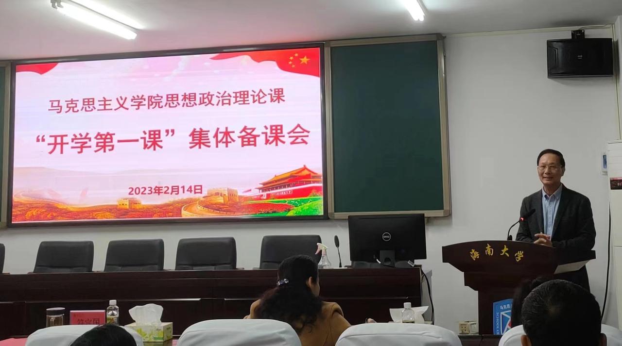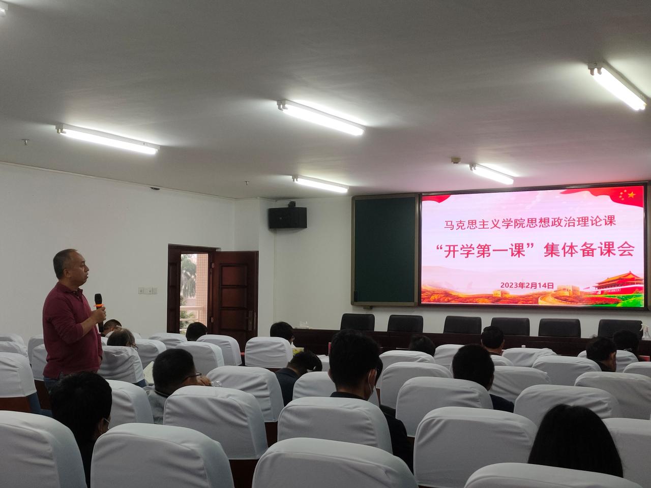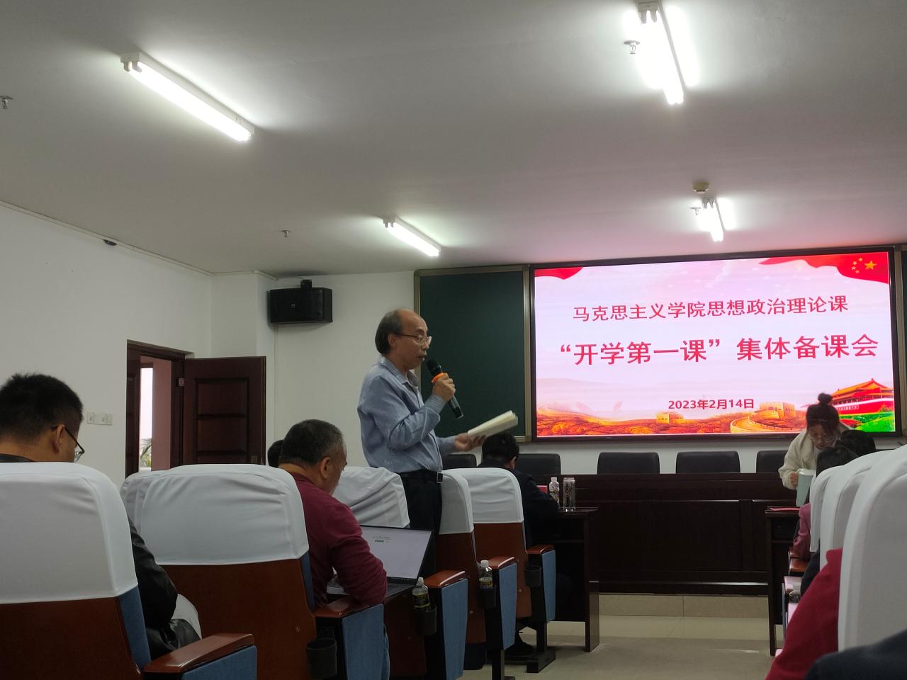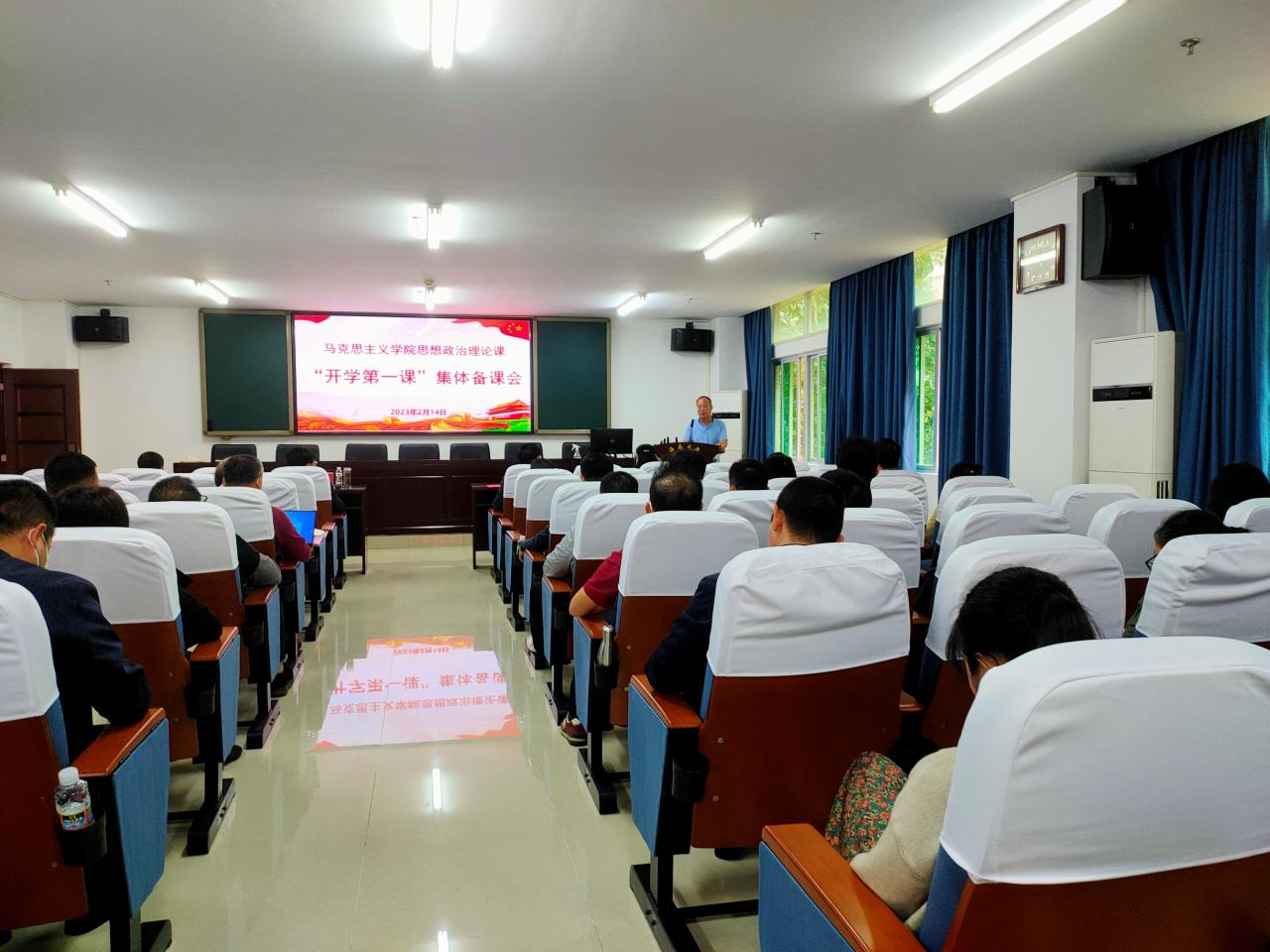 2023年2月14日下午,为深入学习宣传贯彻党的二十大精神,更好地发挥思政课在落实立德树人根本任务中的关键作用,进一步提升思政课教学质量,马克思主义学院召开思想政治理论课“开学第一课”集体备课会。校党委书记符宣国、校党委常委、副校长梁谋、校党委常委、宣传部部长韩淑梅出席;学院领导班子、全体思政课专任教师和书院“形势和政策”课部分教师参加。学院教学督导委员会主任、学院教学委员会副主任贺尧夫老师主持。