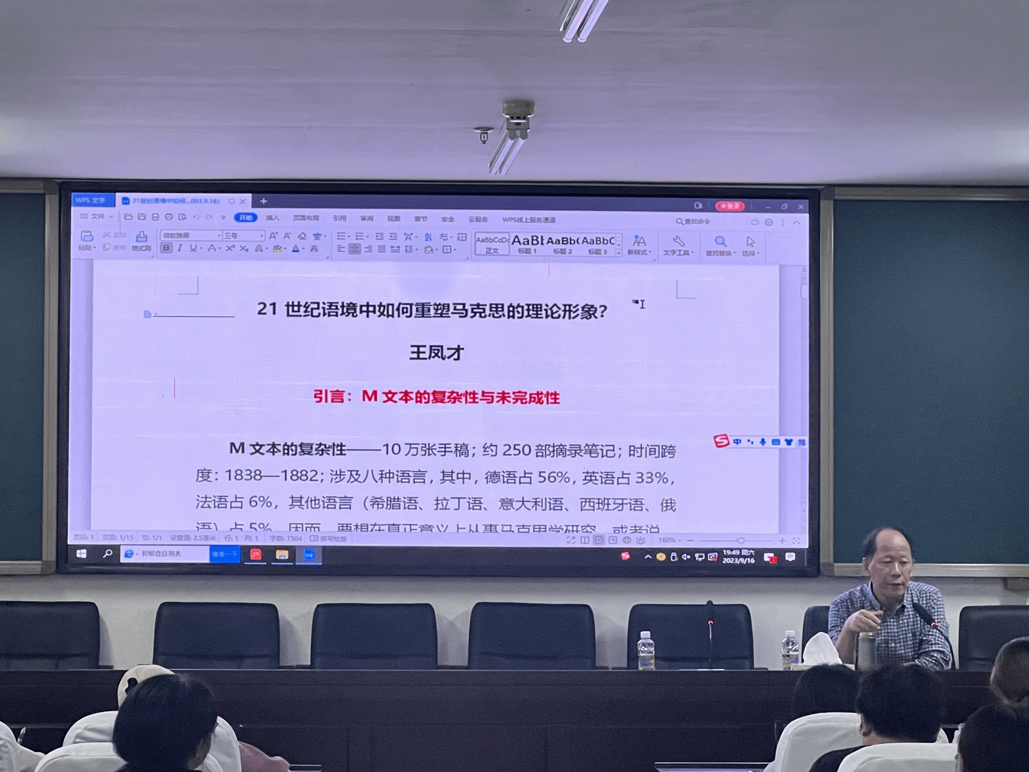 2023年9⽉16⽇晚,海南大学马克思主义学院“冬季小学期系列课程”第一讲在社科楼A309会议室举⾏,复旦大学特聘教授、哲学学院与马克思主义学院博士生导师王凤才教授应邀做了题为“21世纪语境中如何重塑⻢克思的理论形象”的学术报告。报告由永利集团88304官网黄启祥教授主持,2021级本科生以及2023级全体研究生聆听了此次报告。