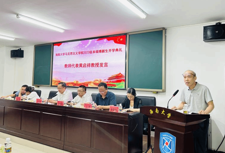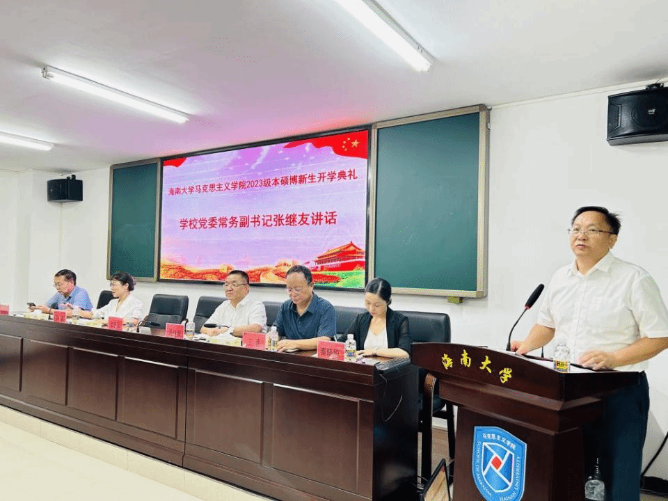 张继友在开学典礼上发表热情洋溢的讲话,他代表学校党委和全体海大师生对马克思主义学院2023级新同学表示祝贺和欢迎,并为全体新同学上了一堂生动的“开学第一课”。他从马克思和燕妮“为全人类而工作”的传奇爱情故事、习近平总书记七年知青岁月的动人成长故事以及自己学习和实践马克思主义的故事导入,勉励马院学子要努力学习、刻苦钻研,真正掌握马克思主义看家本领,自觉担当起强国建设、民族复兴的历史责任。