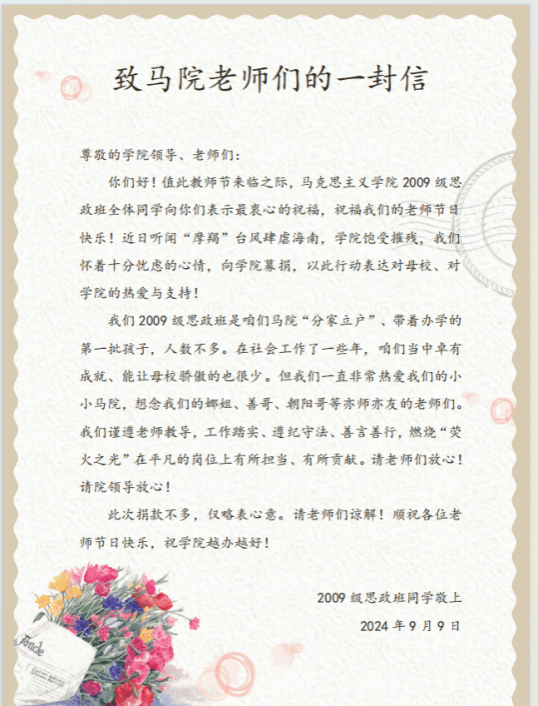 2009级思政班作为马克思主义学院的早期班级之一,虽然人数不多,但每位同学都在社会上取得了各自的成就。他们在信中回忆了与老师们的深厚情谊,并表达了对学院的关切和支持。尽管此次捐款金额不大,但同学们表示这是他们的一份心意,希望能为学院的复苏贡献绵薄之力。