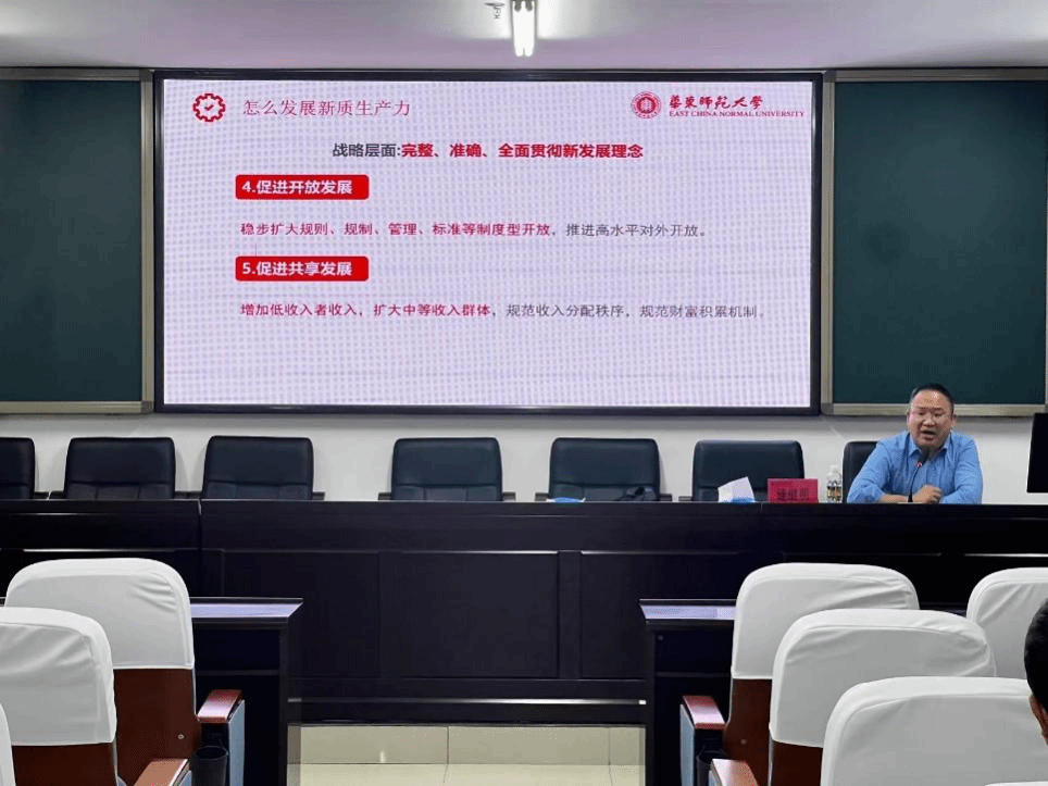 2025年5月10日下午3:30, 应学院邀请,华东师范大学马克思主义学院副院长速继明教授在社科楼A309为师生作“加快发展新质生产力 扎实推进高质量发展”的学术讲座。讲座由永利集团88304官网王善副院长主持,学院部分教师、硕博学生参加了本次讲座。