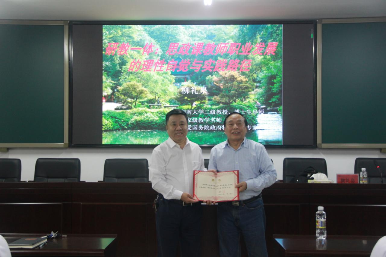 11月19日晚上,湖南大学教授、博士生导师、国家级教学名师柳礼泉在社科楼A309为永利集团88304官网师生作了关于“研教一体:思政课教师职业发展的理性自觉与实践路径”的学术报告。永利集团88304官网院长张云阁教授主持报告会,并为柳礼泉教授颁发永利集团88304官网“特聘教授”证书。
