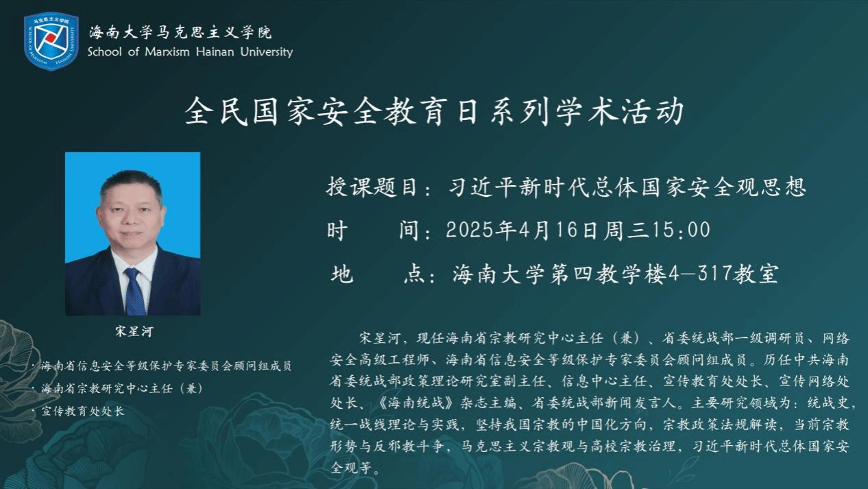 2025年4月16日下午,永利集团88304官网邀请海南省信息安全等级保护专家委员会顾问组成员宋星河,以“习近平新时代总体国家安全观思想”为主题,从历史文化、风险挑战与实践路径三个维度为学生开展讲座。